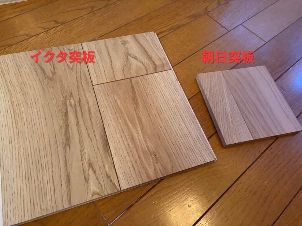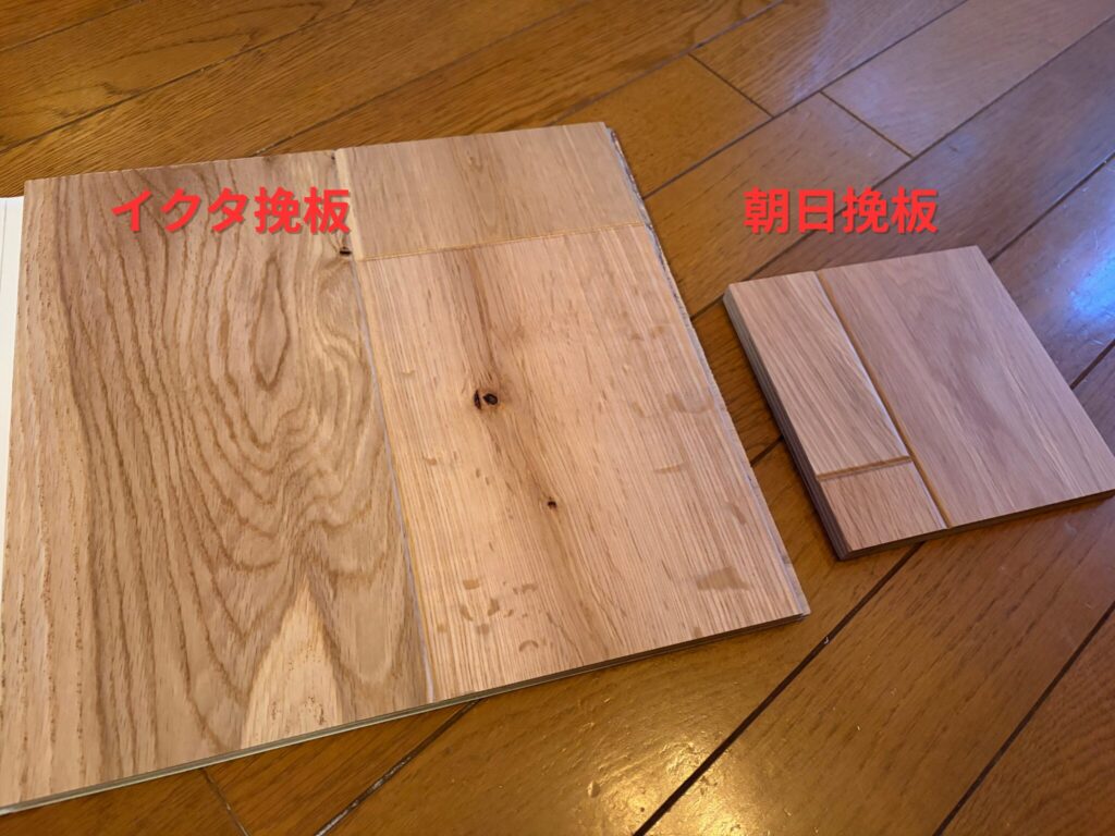 木の質感は朝日ウッドテックが圧倒的に美しいです。節の有無もありますが、木目の入り方がイクタの方が大ぶりでワイルド、朝日ウッドテックは上品なイメージです。