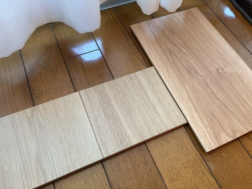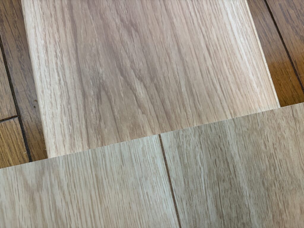 自然光の下で左右に並べると、色みの違いがはっきり出ます。パナソニックはグレーがかった白ベージュ、トリニティは温かみのあるブラウンベージュ。同じ「オーク」でも方向性がまったく違うので、「自分の部屋のインテリアに合うのはどちらか」という視点で考えてみてください。