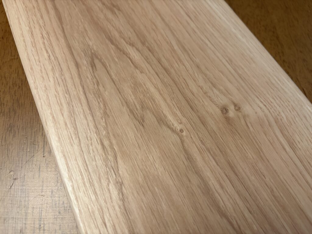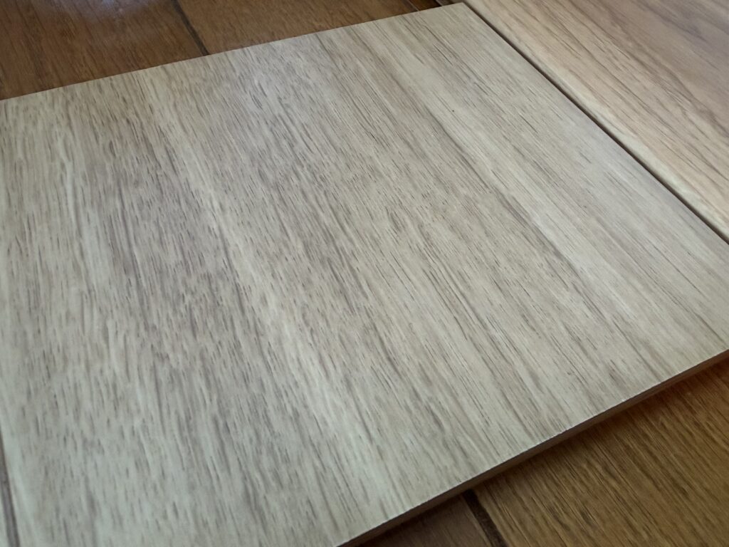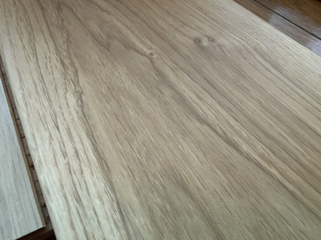 トリニティは摩擦がしっかりあります。サラサラ・ツルツル感がほぼなくて、足裏に素材感が伝わってくる。目を閉じても「これ、シートかな?」と一瞬迷うくらいです。朝日ウッドテックの突き板と比べると木材感では劣りますが、シート材の中では別格の足触りだと思います。
