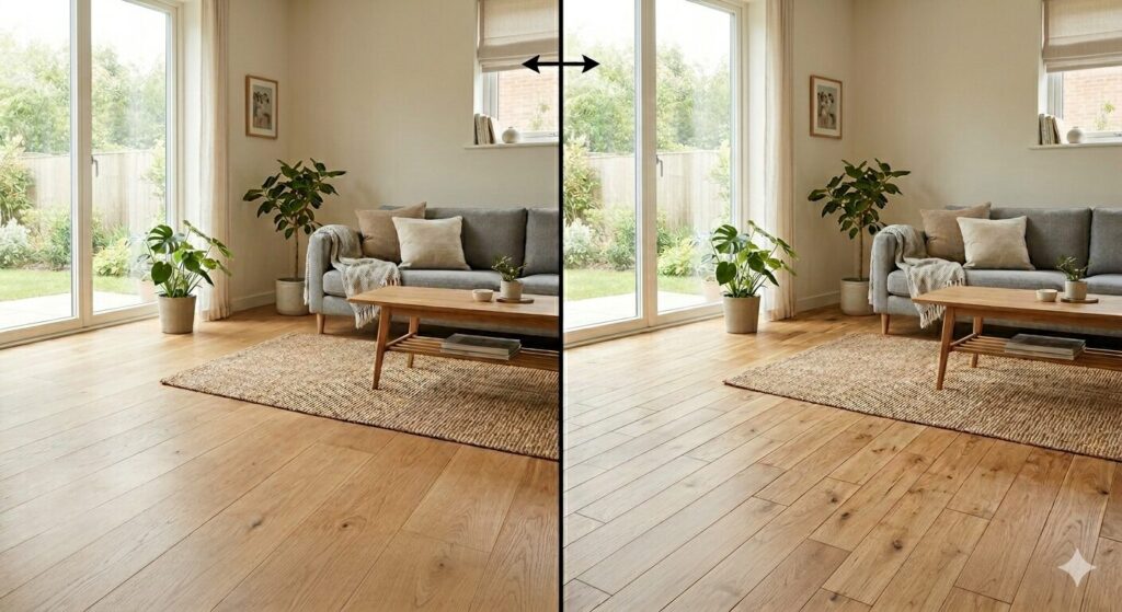 床って、ショールームや写真では正面から見ることが多いですが、実際の生活では斜めから・遠くから・いろんな角度で目に入りますよね。「角度を変えたときにどう見えるか」は、長く住んでから気になってくるポイントだと思います。そういう意味でも、この差は見ておく価値があります。