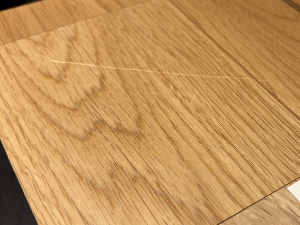 無垢材や挽き板の傷は、使い込むうちに「ヴィンテージ感」「生活の証」として味になっていきます。でもラシッサDの傷は、表面シートが剥がれると茶色い基材が露出します。