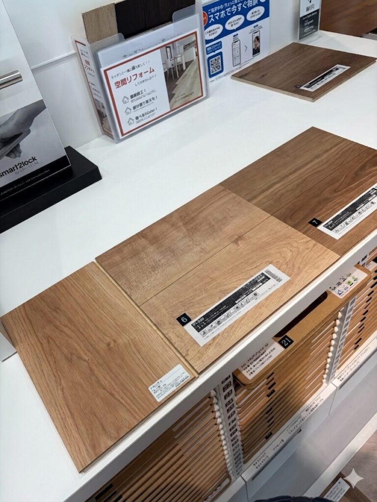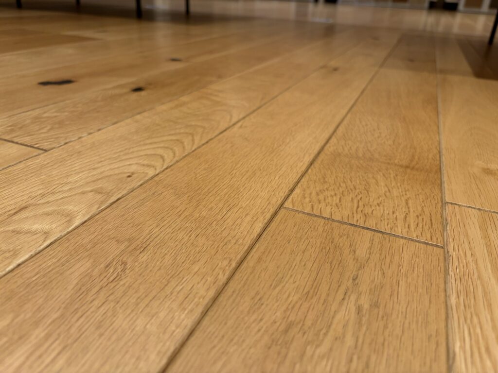ショールームでスタッフさんに「床暖房をずっとつけているが、ほぼ縮んでいない」と言っていただき、耐久性への安心感も得られました。天然木のネックとして「床暖で縮む・反る」という話がありますが、朝日ウッドテックの突き板はその点での問題が少ないようです。