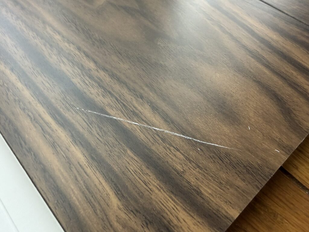 ラシッサD(シート材)に深い傷がつくと、シートが剥がれて白い合板基材が見えてしまいます。「傷として明確に残る」状態になり、気になり始めると修復も難しい。