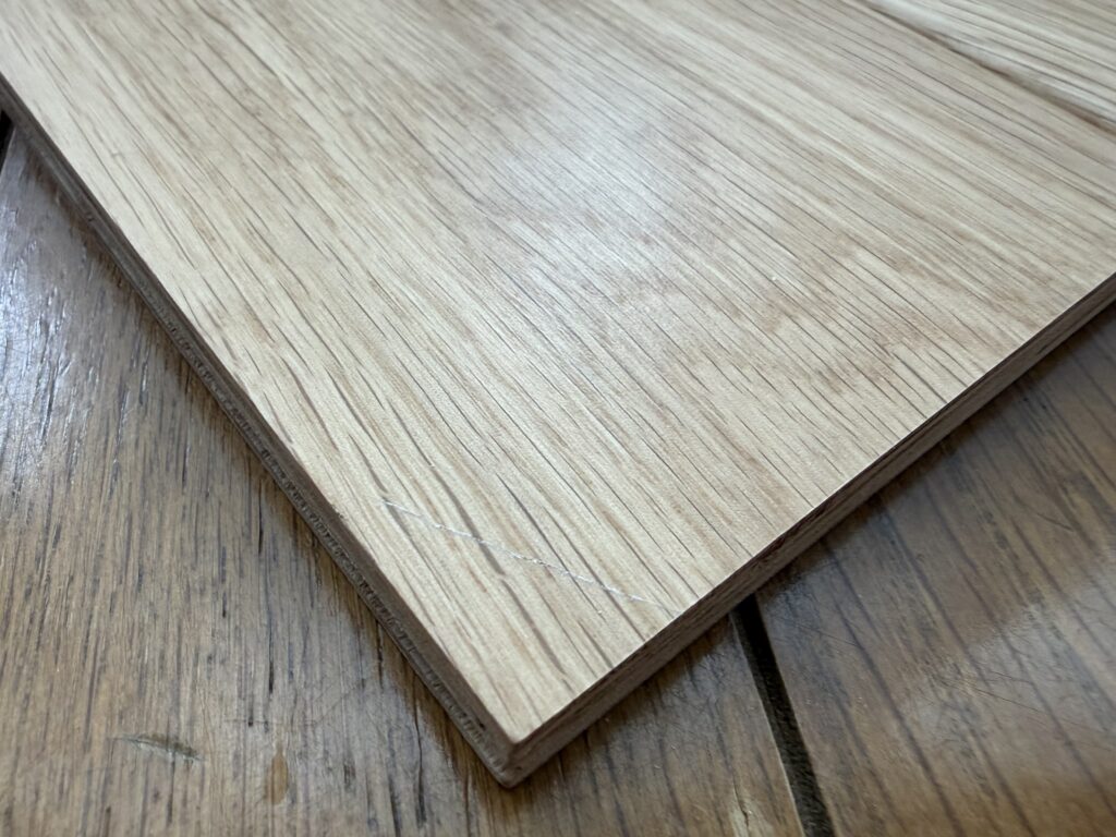朝日ウッドテックに傷がつくと、天然木の傷なので「木の傷」として見えます。全体の木目の表情と馴染みやすく、経年変化と合わさって「味のある傷」になっていきます。天然木はシート材と比べて傷で毛羽立ちが出にくいという特性もあります。