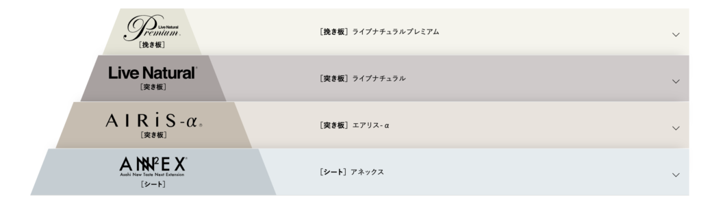 無垢床は扱っておらず、挽板・突板・シートを販売しています。特に有名なのは、「Live Natural(ライブナチュラル)」シリーズで、2023年には「Live Natural Premium オール国産材」がグッドデザイン賞を受賞しました。
