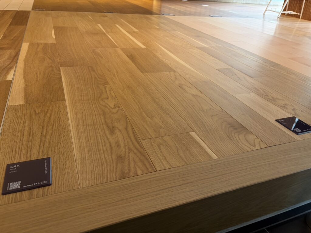 一方の突板は、寸法安定性が高いため床暖房との相性が良く、対応モデルも豊富です。私の場合、床暖房は一部屋分だけ(ダイニング)の予定なので、この点でも突板が安心でした。