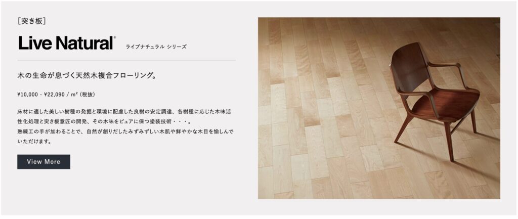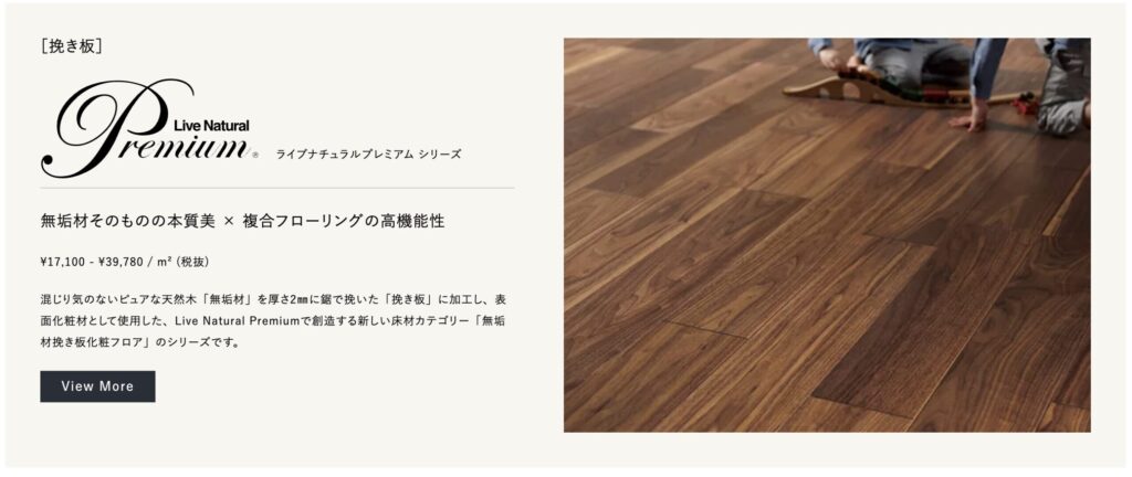 | ライブナチュラルプレミアム | 挽板 | 高め | 無垢に最も近い踏み心地と質感 |