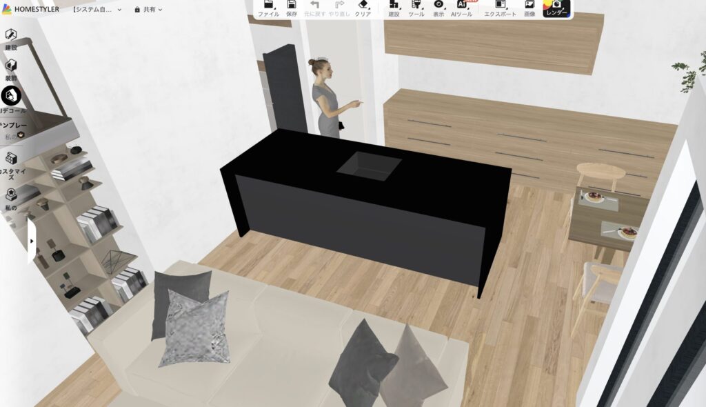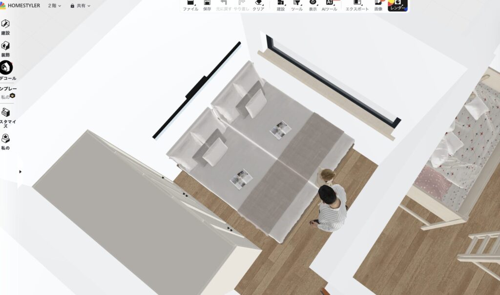 HomeStylerという無料ツールがあって、間取り図面を読み込むと3Dで立体化してくれます。実際に使う家具を置いて、空間の広さをリアルにイメージできる。