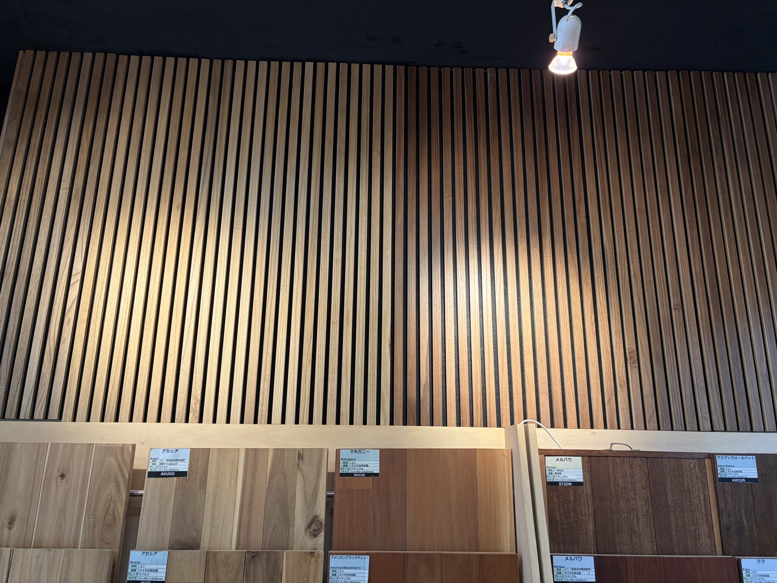縦に細い木のラインが並ぶデザインは、ホテルのロビーやモデルハウスでよく見かけるあの雰囲気。「あれ、どこかで見たことある…!」という方も多いはず。